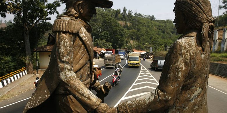 Cadas pangeran patung. Cadas Pangeran merupakan salah satu bagian dari jalur Jalan Raya Pos De Groote Postweg yang membentang sepanjang kurang lebih 1100 km mulai dari Anyer di Banten sampai Panarukan di Jawa Timur. Kisah ini menjadi simbol di patung yang dipasang di Tugu Cadas Pangeran. Eh tapi ini bukan lantaran pematung tak professional lho.